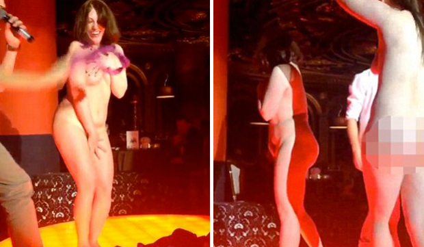 Seguido a esto, aparece la otra joven quien tambien está completamente desnuda y se coloca junto a la primera, ya que están en el escenario ambas comienzan a bailar de manera provocativa ante la algarabía de los presentes.