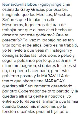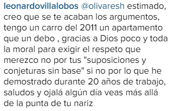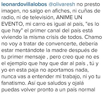 Muchos de sus seguidores han comprendido las circunstancias que ha explicado y le han brindado apoyo pero Villalobos también ha estado recibiendo fuertes críticas por parte de algunos de sus seguidores, que lo han insultado por prestar su imagen a ese evento. Cansado probablemente de los señalamientos, el conductor de Sábado Sensacional se ha defendido en las redes sociales a veces hasta respondiendo uno a uno a sus críticos.