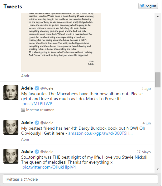[dropcap]L[/dropcap]a exitosa cantante Adeleconfesó en una entrevista con la BBCque tiene prohibido enviar sus propios tuits sin antes obtener el visto bueno de su equipo de redes sociales. Sus mánagers decidieron tomar esta medida porque durante un tiempo tuvo la mala costumbre detuitear bajo los efectos del alcohol.