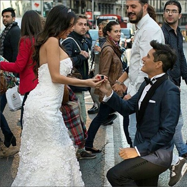 «Te imaginas que te pidan la mano y te entreguen un#AnilloDeCompromiso en medio de la sesión de fotos de una nueva campaña de bodas y de paso en medio de la#GranVia??? Pues, me pasó! ??? Literalmente, @soydomenico y yo, comprometidos!!! ? #Madrid«, agregó Andreina en su cuenta personal.