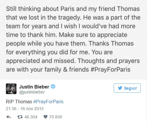 El cantante canadiese ha querido rendirle homenaje en uno de sus concierto y transmitir un mensaje compartiendo como se siente desde su cuenta de Twitter mediante un comunicado. «Aún pienso en Paris y en mi amigo Thomas al que perdimos en la tragedia. Él fue parte de mi equipo durante años y me habría gustado haber tenido más tiempo para darle las gracias», cuenta.
