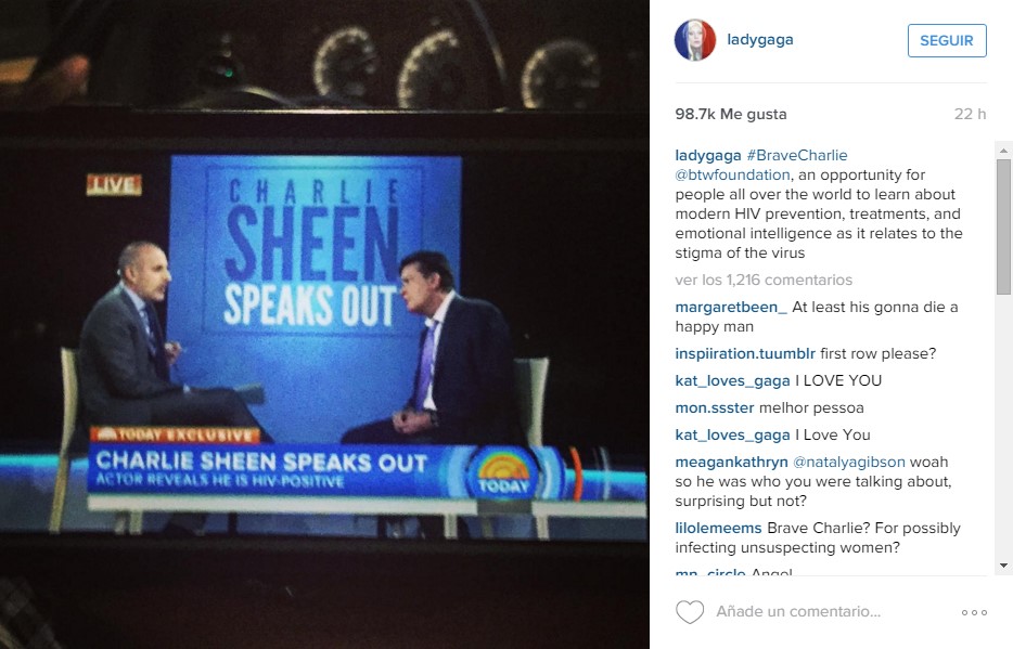 [dropcap]L[/dropcap]a cantante estadounidense Lady Gaga considera que el actor Charlie Sheen es valiente por revelar su condición.