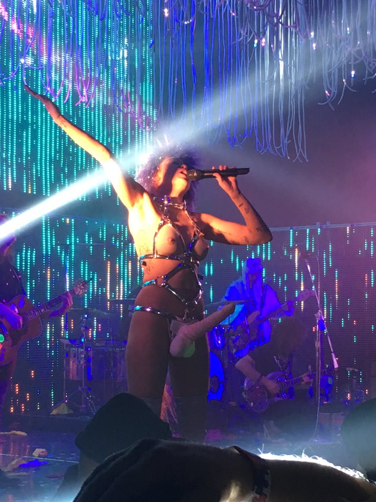 La que un tiempo fue llamada «Hannah Montana» se presentó anoche en Chicago como parte de su presentación para promocionar el material «Miley Cyrus & Her Dead Petz«, vestida con un sostén que se asemejaba a «sus senos», un cinturón con un miembro masculino de plástico y una peluca morada.
