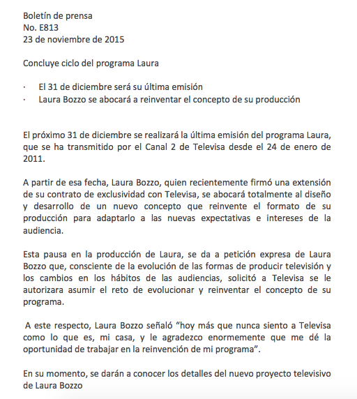 Luego de que el pasado sábado 21 de noviembre comenzaran los rumores en torno a la posible cancelación del talk show de Laura Bozzo, ahora este lunes 23 de noviembre se confirmó que el programa ‘Laura’ sale del aire de Televisa.