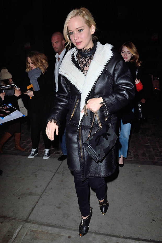 Durante su cita de niñas, JLaw lució efortless sexy al combinar ajustados pantalones negros con botines y una blusa de encaje, bajo un abrigo de cuero.