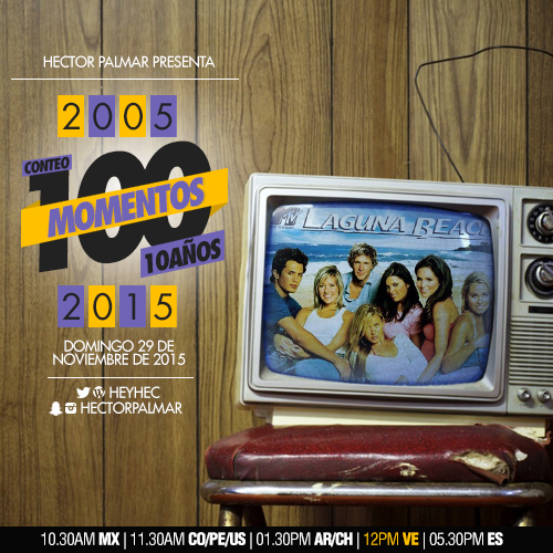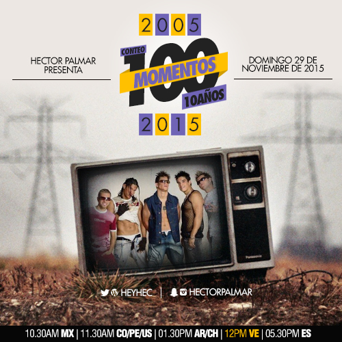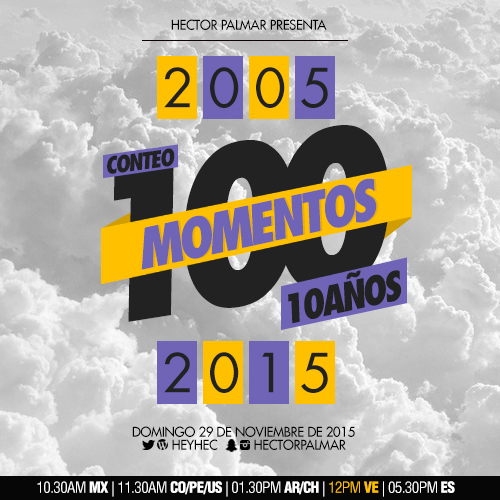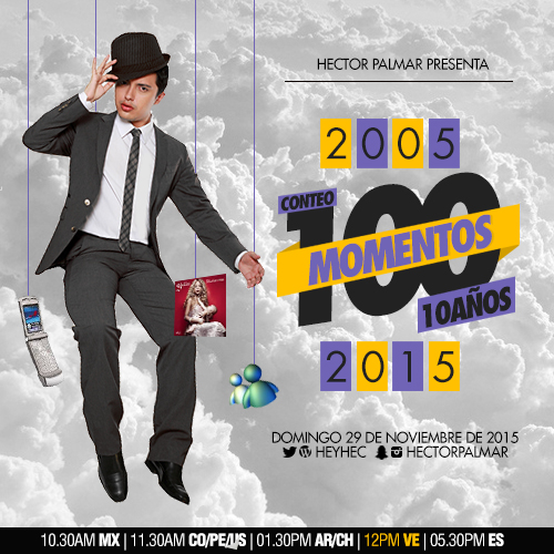El conteo iniciará a las 12:00 PM del domingo 29 de noviembre de 2015 cuando con 100 publicaciones se irá revelando posición por posición en cuenta regresiva en una programación especial que se extiende por 10 horas en paralelo por las cuentas «heyhec» en Twitter y «hectorpalmar» en Instagram, todas unificadas con la etiqueta #Los100DeHace10Años.