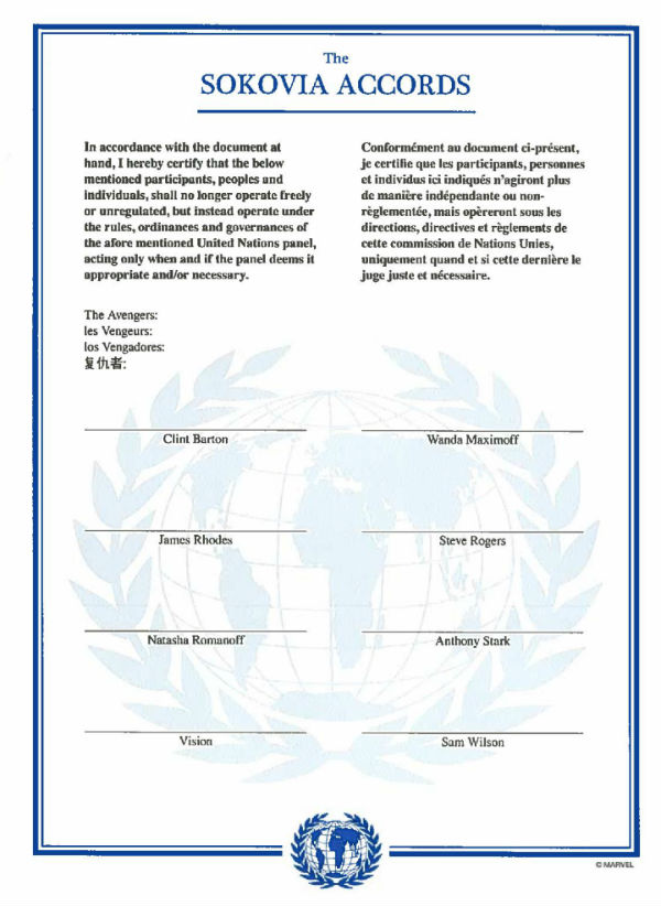 Los Acuerdos de Sokovia, creados como consecuencia de la batalla ocurrida en Vengadores: La era de Ultrón, funcionarán como el documento antes mencionado en el Universo Cinematográfico de Marvel y se convertirán en el punto de partida de la Guerra Civil entre el bando liderado por el Capitán América (Chris Evans) y el de Iron Man (Robert Downey Jr.).