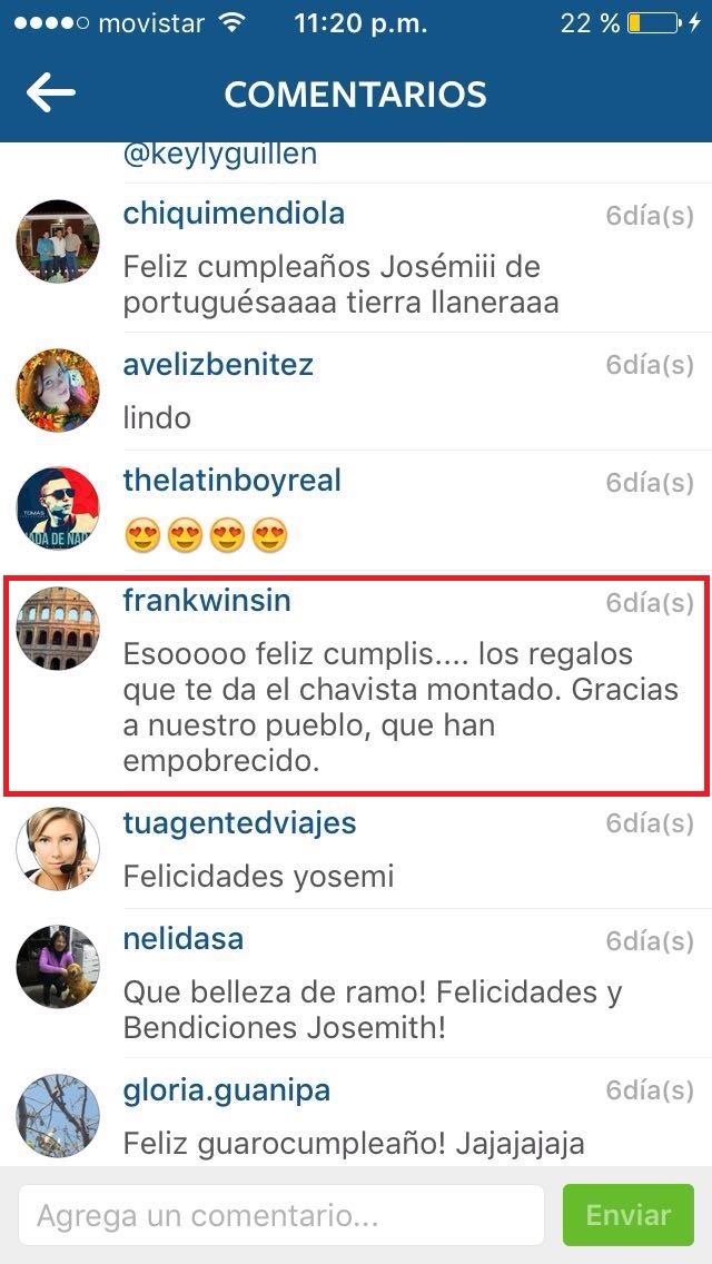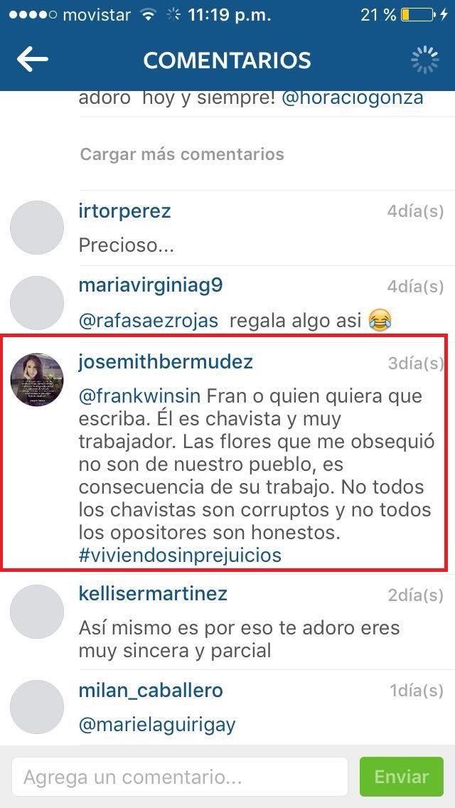 Aunque todo parecía normal, un usuario aprovechó la ocasión para «criticar» el obsequio de Bermúdez alegando que ese regalo es gracias a que su pareja, Horacio Gonzalez es adepto al gobierno venezolano; esto no lo gustó mucho a la animadora y rápidamente salió a la defensa de su pareja.
