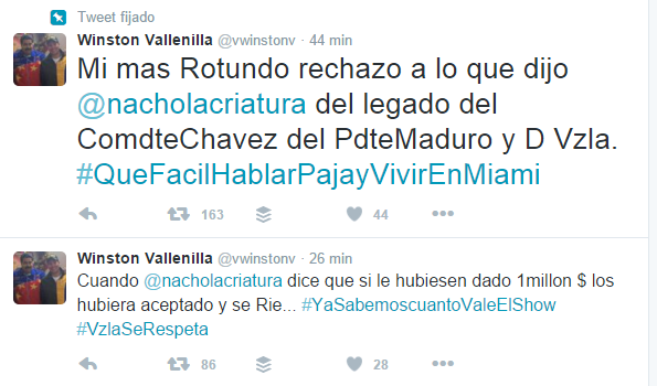 Luego de su discurso, Nacho, fue tendencia en las redes sociales, y fueron muchos los artistas que se pronunciaron a favor del cantante por sus palabras que reflejaron lo que opina sobre la situación que se vive en el país. Pero también hubo algunos detractores, entre ellos el Presidente de la Televisora Venezolana Social (Tves) Winston Vallenilla, quien se pronunció a través de twitter indicando tu completo rechazo a las palabras del artista.