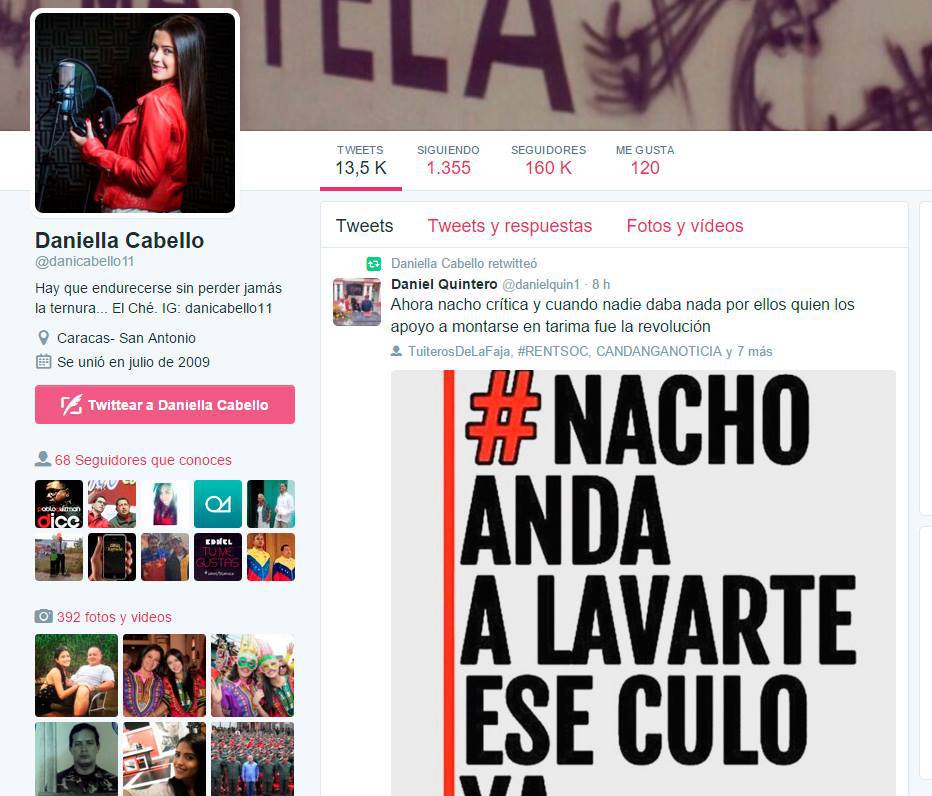 Aunque, Cabello se limitó a contestarle a Nacho haciendo RT a un seguidor de ella en Twitter. El el cual le sugirió de forma despectiva hacía el compositor y empresario venezolano.