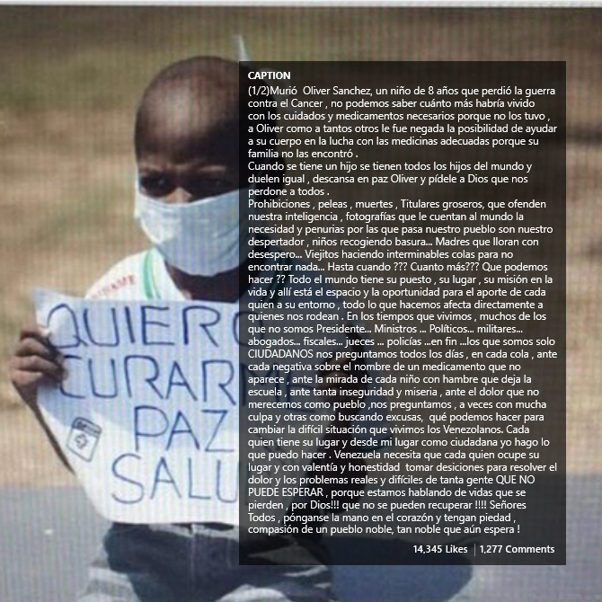 La reciente muerte de otro niño venezolano a causa de la crisis de medicamentos, fue el detonante de el siguiente mensaje compartido por Maite en su cuenta de Instagram: «ALEXANDER GUERRA De nuevo… Otra vez… Hoy volvemos a llorar… En realidad no hemos parado ! Hoy toca volver a pedir perdón a un niño inocente que también MUERE porque le negaron su derecho a la vida ! Perdón ALEXANDER , aunque con esta palabra no te devolveremos la vida ni tampoco se la devolveremos a tu mamá que segura estoy también muere contigo ! Pongo tu nombre en letras grandotas ALEXANDER al igual que OLIVER porque ustedes son tan solo 2 de los tantos y tantos niños que están pagando el precio a tanta ineptitud a tanto egoísmo a tanta injusticia ! Por Dios , hasta donde va a llegar esto? Cuantos más tendremos que llorar? Donde están los responsables de que nuestros enfermos NO TENGAN MEDICINAS ??? Donde están los correctivos ???? Donde está el dinero??? Donde están las medicinas???? Estas caritas reclamarán por siempre JUSTICIA y descansarán en paz sólo cuando nadie más muera por culpa de la indolencia de quienes tienen el poder de detener esta locura»#MEDICINASYA #RESPONSABLESYA#NOMASMUERTES#CANALHUMANITARIO #SOLUCIONES#AMOR #PIEDAD #BONDAD #NOMAS