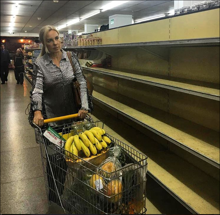 La fotografía, explica la situación político-económica que vive Venezuela y la protagonista de la imagen es la primera dama de la Asamblea Nacional venezolana, Diana D’Agostino quién se aventuró en algún de los mercado de la ciudad de Caracas, y decidió hacer algunas compras y a juzgar por la imagen, se puede notar la escasez que azota al país suramericano.