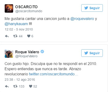 “¡Me gustaría cantar una canción junto a Roque Valero y Hany Kauam!”, publicó Oscarcito en la red social Twitter, en noviembre de 2010.