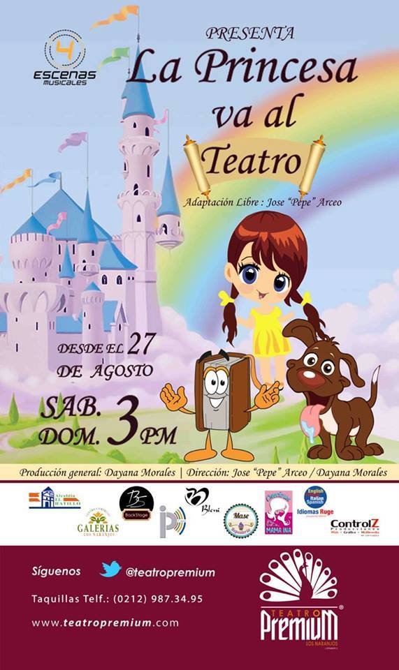[dropcap]D[/dropcap]esde el 27 de Agosto llega a la sala del Teatro Premium del C.C. Galerías Los Naranjos, Nivel Pasarela, la obra infantil La Princesa va al teatroproducida por Dayana Morales y dirigida por José “Pepe” Arceo del grupo 4 Escenas Musicales. Las funciones se realizarán todos los sábados y domingos a las 3:00 de la tarde.