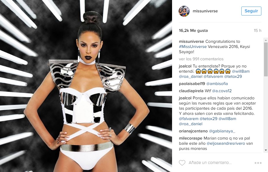 En las redes se creó gran controversia luego que la cuenta oficina del Miss Universe en Instagram felicitara, de manera sorpresiva, a Keysi Sayago, actual Miss Venezuela, cosa que solo han hecho con las candidatas que irán al certamen que se celebrará en Filipinas el próximo 30 de enero de 2017.