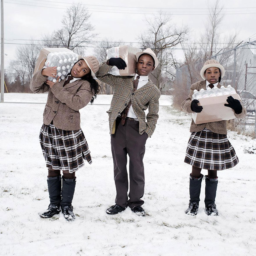 Los hermanos Julie, Antonio e India Abram recogen su dosis diaria de agua embotellada del cuartel de bomberos en Flint, Michigan.