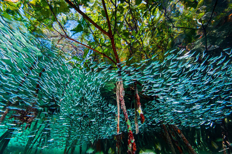 Sardinas nadando a través de los manglares en los arrecifes de coral de Cuba. Estos peces del tamaño de un dedo forman grandes bancos para intentar confundir a los depredadores.