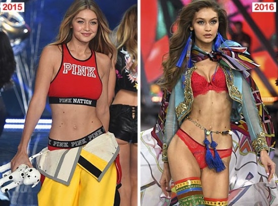 Si comparamos la figura de Hadid en el Victoria’s Secret Fashion Show 2015 y lo comparamos con el actual se puede ver la gran perdida de peso que ha sufrido la modelo.