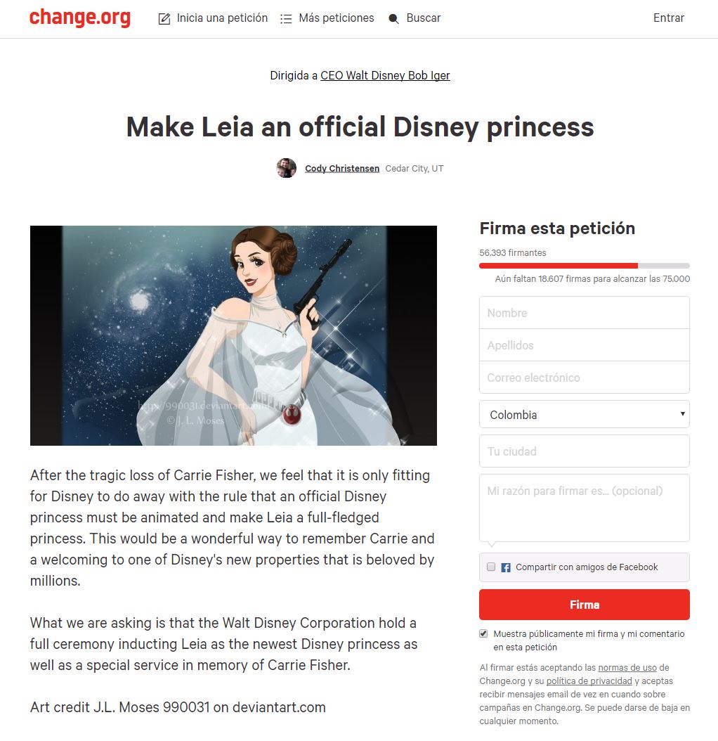 El pasado 27 de diciembre el mundo del cine se vio afectado por la desaparición de la gran actriz Carrie Fisher, ahora a pocas semanas de su fallecimiento una grupo de fanáticos están realizando una compaña para que su icónico personaje (La princesa Leia) forme parte de la lista de las princesas de Disney, en la que se encuentran desde Blancanieves, Bella, Cenicienta, Mulán, Pocahontas y Ariel, seguidores de ‘Star Wars’ están recolectando firmas a través de Change.org