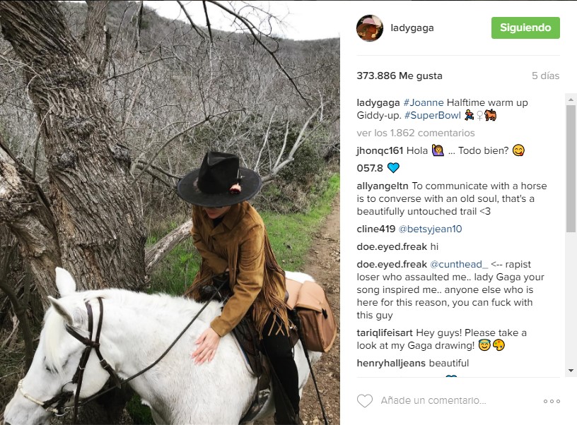 Con el gran empujón que le dio su nuevo disco, Joanne, en los últimos meses de 2016, Lady Gaga ahora le pone la mira a este año, con varias metas por delante. La cantante ya está ensayando para su show en el entretiempo del Super Bowl y compartió una foto en sus redes, donde se la ve charlando con sus músicos, y otra donde entrena con su caballo.