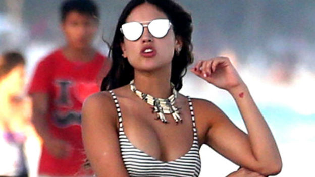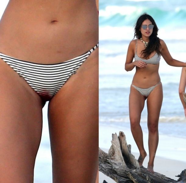 Eiza pasó año nuevo en la playa donde lució un diminuto bikini color blanco, el cual dejó al descubierto que Eiza estaba en sus días y un indiscreto paparazzi al darse cuenta de esto se enfocó a tomar la mancha que se dejaba ver.