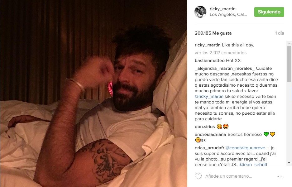 Ricky Martin ha generado gran repercusión entre los millones de seguidores que acumula en su perfil de Instagram al compartir una imagen en la que aparece postrado en una cama, sin afeitar, y con los ojos algo hinchados a consecuencia de lo que podría ser exceso de cansancio. La fotografía y el mensaje que la acompaña dejan entrever de alguna forma que el intérprete no se encuentra precisamente en su mejor estado.