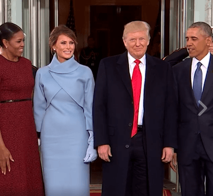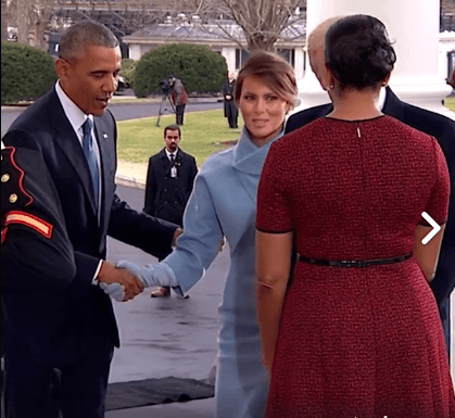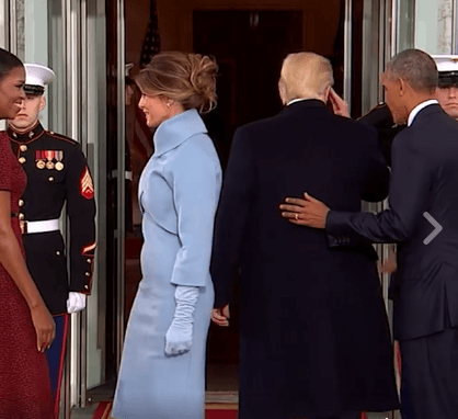 Sola y visiblemente apenada, Melania Trump tuvo que caminar hacia él y los Obama radiante en un traje azul y unas zapatillas hermosas, en mano, el regalo que posteriormente dio a Michelle y que al parecer es joyería o un diario de la marca Tiffany.