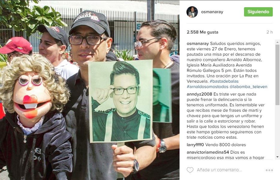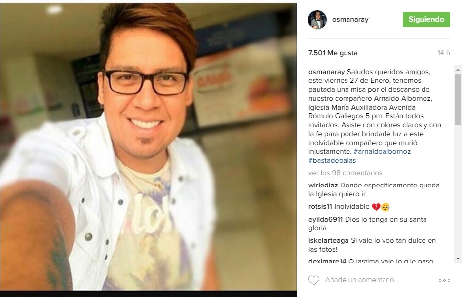 El animador del programa La Bomba, Osman Aray y el resto del equipo de producción, informaron a través de sus redes sociales que el próximo viernes 27 de enero se hará una misa en honor a su compañero, Arnaldo Albornoz, quien fue asesinado cuando intentaron robarle su vehículo a las afueras de su residencia ubicada en Caricuao, Caracas – Venezuela.