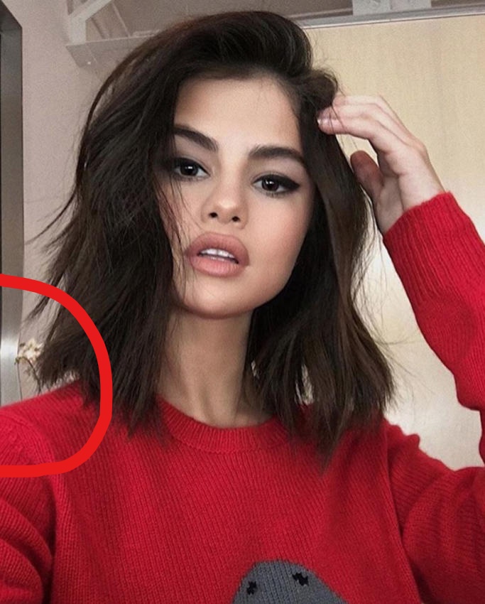 Los seguidores de Hung y de Selena no pudieron evitar darse cuenta de que justo arriba del hombro de la cantante la pared parece estar doblada, lo que muchos fans no entienden es el porqué de esta alteración en la fotografía.