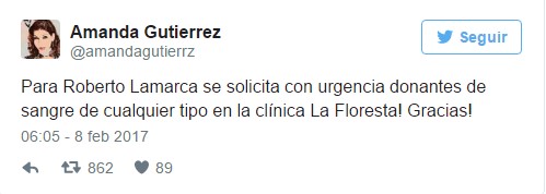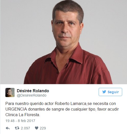 El primer actor Roberto Lamarca requiere con urgencia donantes de sangre, así lo informó a través de su cuenta en Twitter la actriz Amanda Gutiérrez.