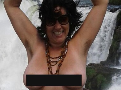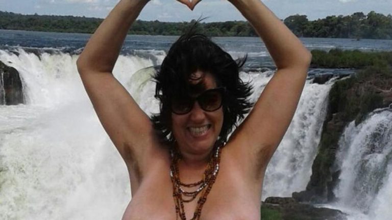 Con los senos al aire delante el hermoso fondo de las cataratas de Iguazú, en la frontera de Brasil y Argentina, Pizarro aparece contenta y alzando los brazos para posar su libertad.