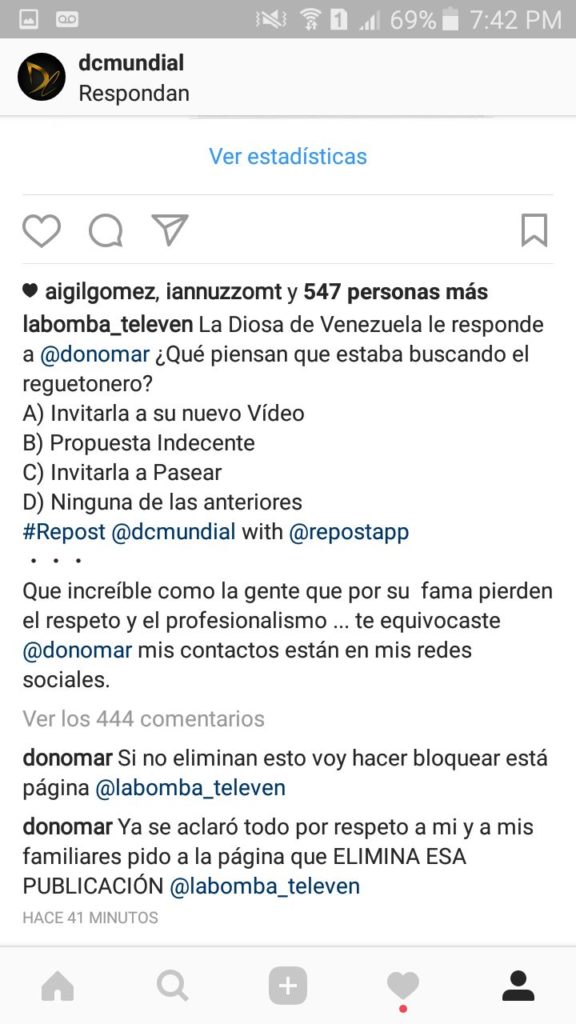 En vista de que Diosa borró la publicación, La Bomba es una de las únicas cuenta que se mantiene con la imagen, lo que provocó la molestia inmediata del reguetonero puertorriqueño, quien prometió con mandar a bloquearlos sino eliminaban la imagen de su perfil.