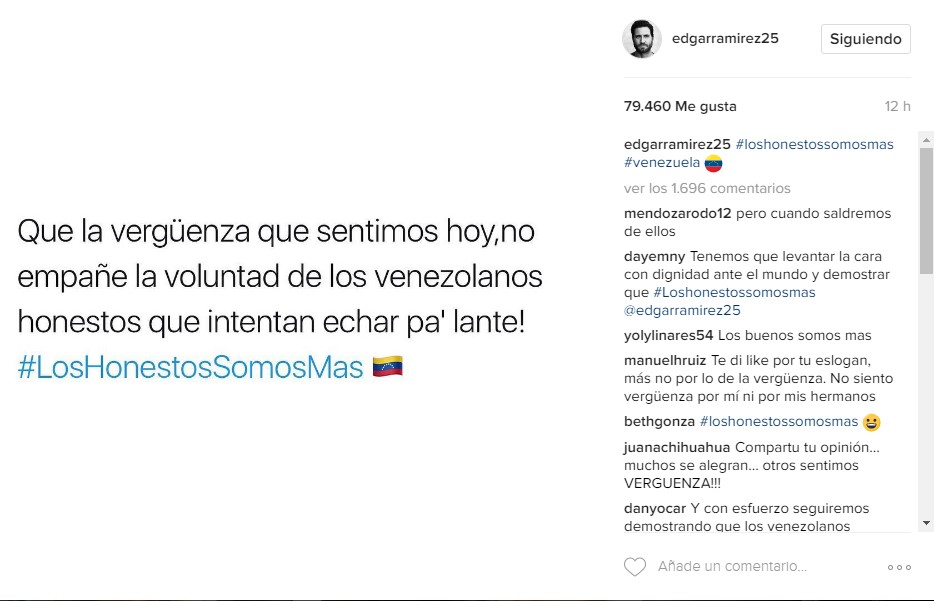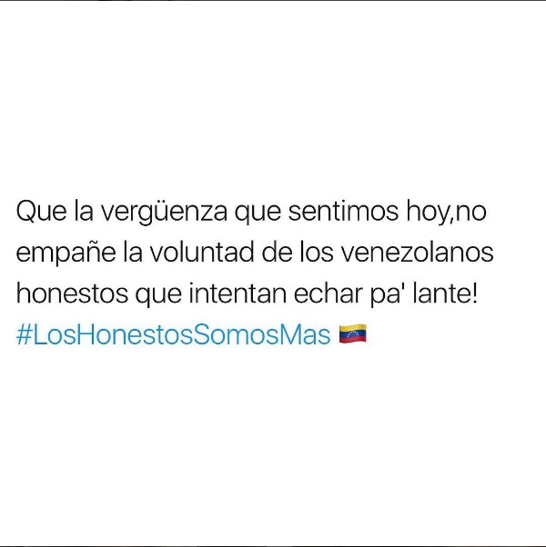 “Que la vergüenza que sentimos hoy no empañe la voluntad de los venezolanos honestos que intentan echar ¡pa’ lante!”, escribió en su cuenta de Instagram.