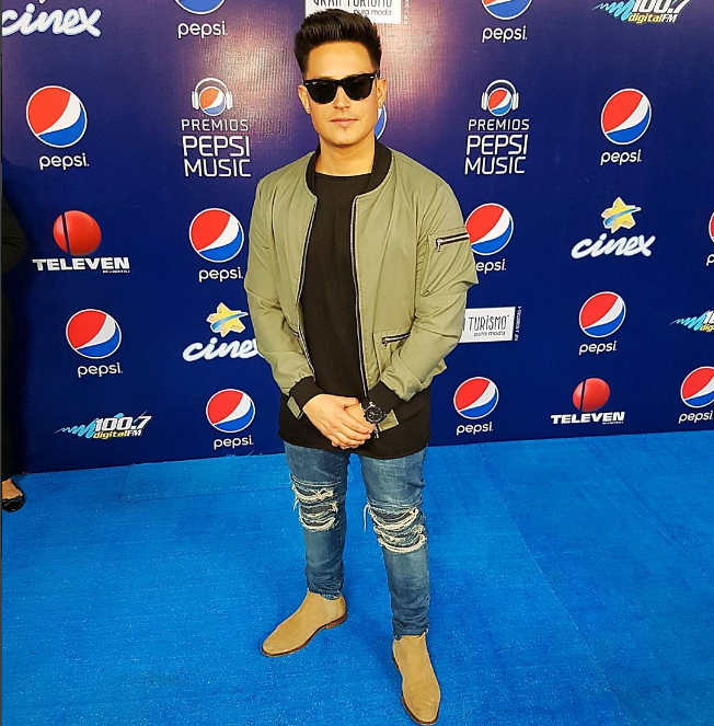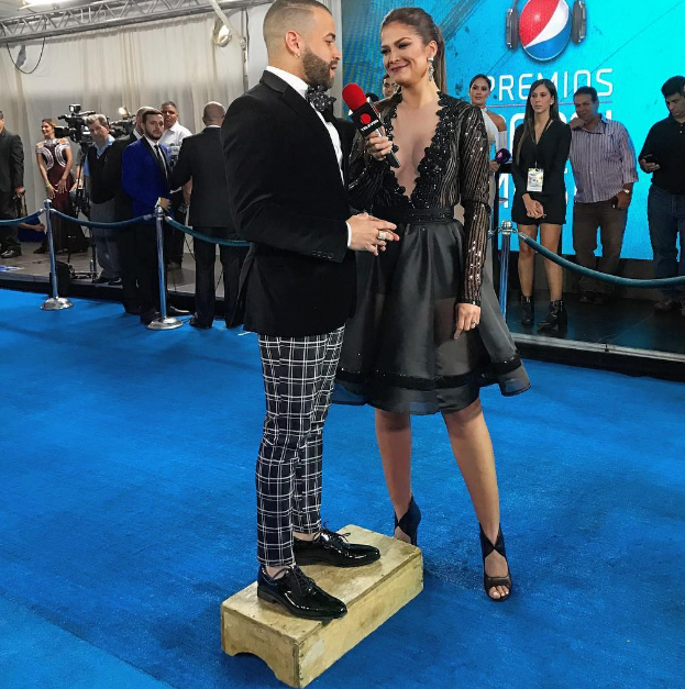 El cantante Chucho definitivamente no acertó en esta alfombra, las piezas largas en personas de poca estatura no favorecen para nada.