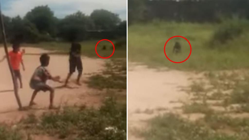 En la grabación se puede ver a un grupo de niños del barrio Bosco III, jugando una ‘cascarita’ cuando de pronto una pequeña silueta aparece entre el pasto, pero el único que le pone suma atención es un perro que se encuentra acompañando a los menores.