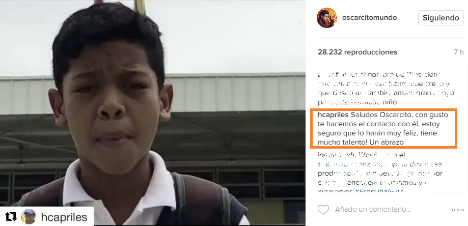 “Con el permiso de sus padres y/o representantes, me gustaría hacer una producción para esta canción. @hcapriles que me dices?”, escribió Oscarcito, a los que Capriles respondió: “saludos Oscarcito, con gusto te hacemos el contacto con él, estoy seguro que lo harán muy feliz, tiene mucho talento. Un abrazo”.