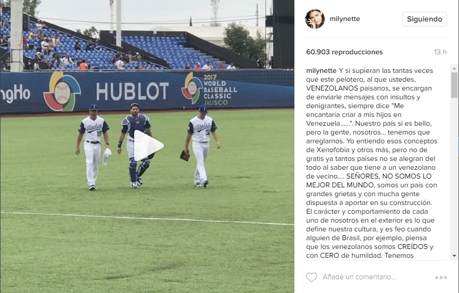 Publicó tres fotos y un video en su cuenta de Instagram a favor del beisbolista, que recibió la oportunidad de jugar con Italia en 2009 antes que en Venezuela por no tener cabida en la selección y no ha parado de recibir insultos.