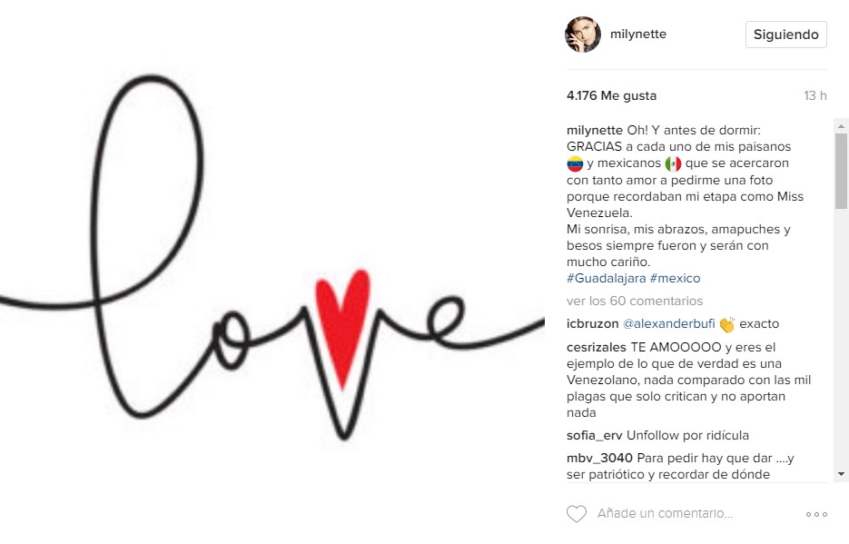 «Me perdonan que lo publique pero nos hemos convertido en envidiosos, chismosos, CRITICONES, vulgares y DESLEALES. Esto lo empecé a ver cuando termine mi participación en el MU, ahora lo ratifico con el comportamiento de la MAYORÍA de los Venezolanos que estaba en el estadio de GUADALAJARA ??. En cuanto vieron que Venezuela estaba perdiendo ante Italia (5-0) en vez de seguir firmes con «el sentido patriótico» que dicen tener, se encargaron de insultar y humillar a todos los jugadores de ??», escribió en una de las publicaciones.