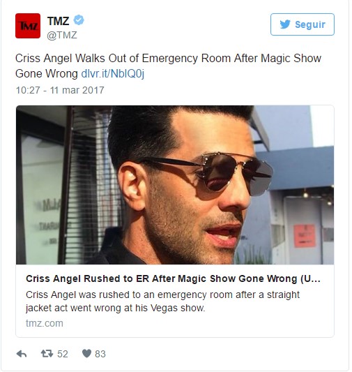 De acuerdo al portal TMZ, el mago, quien es pareja de la actriz y cantante mexicana Belinda, estaba suspendido de cabeza en el aire intentando escapar de una camisa de fuerza, cuando de pronto, se desmayó frente a la audiencia.