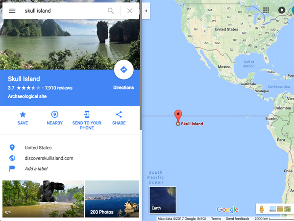 Si creías que esta película se basada en algo fantasioso, estas en todo lo correcto, jamás ha existido un gorila de tamaño gigantesco. Sin embargo, este nuevo film de Warner tiene algo de cierto, y se trata sobre la isla donde ocurre gran parte de la trama. La Isla Calavera, existe y Google Maps lo confirma.