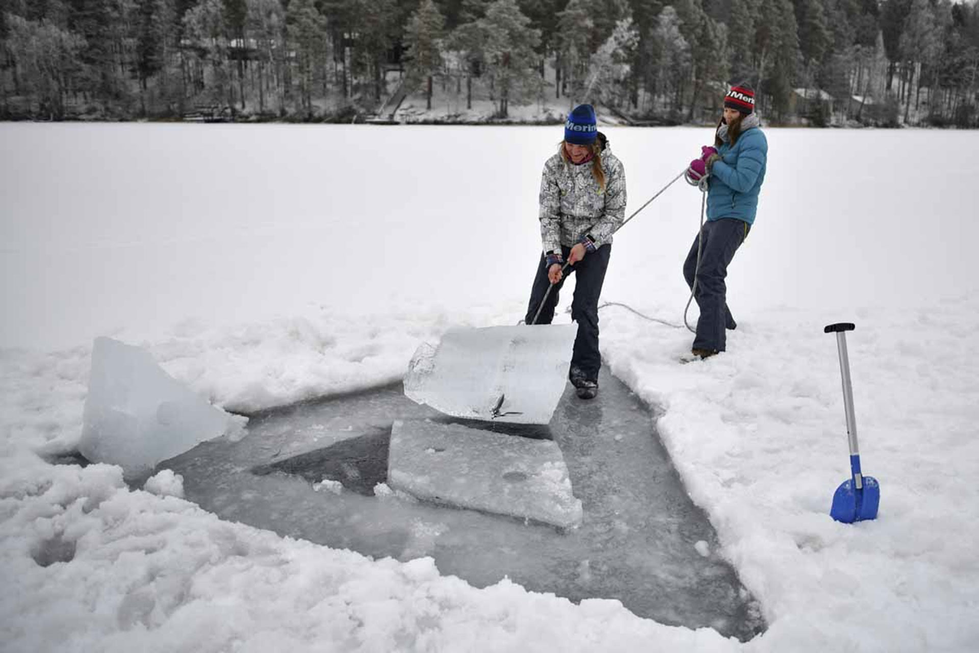 Primero taladraron los agujeros, luego cortaron los lados con una sierra eléctrica y finalmente removieron el hielo de la superficie del agua.