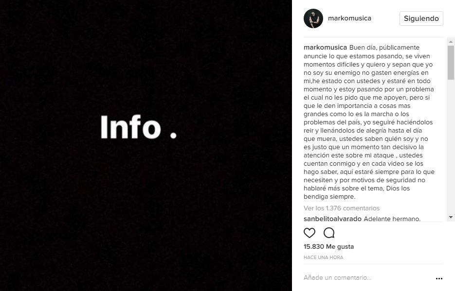 Ante lo delicado de la publicación, Marko decidió borrar el video y publicó una imagen informativa.
