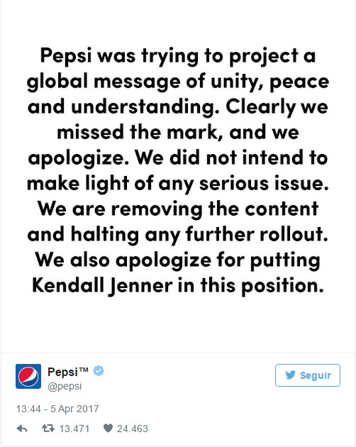 Después de que Pepsi eliminara el comercial que Kendall realizó para la marca debido a la controversia que despertó en redes sociales, la compañía se disculpó con la modelo en un comunicando de prensa que decía: “En Pepsi tratábamos de projectar un mensaje de unidad global, paz y entendimiento. Obviamente no hemos acertado esta vez y nos disculpamos. No teníamos la intención de tomar con ligereza ningún tema serio. Procederemos a remover el contenido y detendremos cualquier futura difusión. Adicionalmente lamentamos haber involucrado a Kendall Jenner en esta situación»