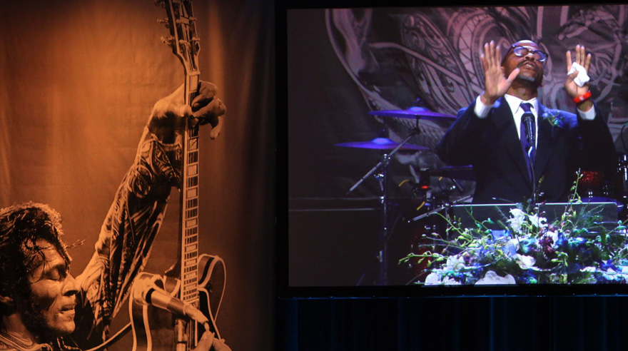 Uno de los arreglos florales dentro del salón tenía la forma de guitarra. Lo enviaron los Rolling Stones, una de muchas bandas que fue influida profundamente por el rockero de St. Louis.