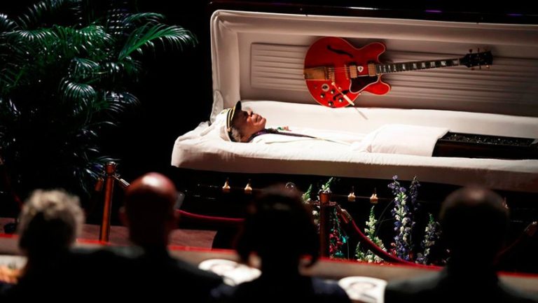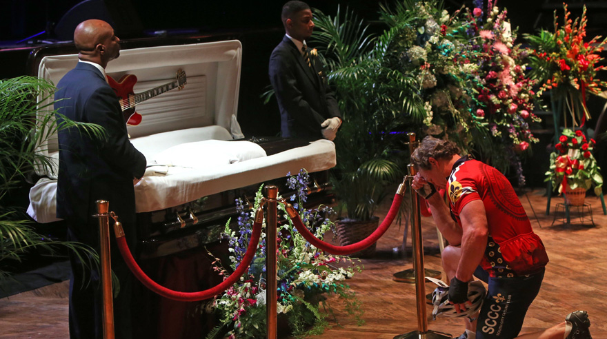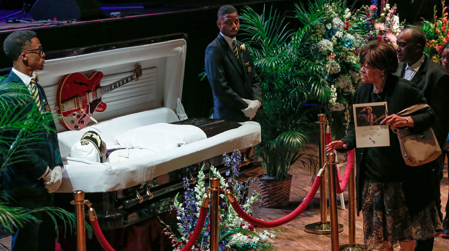Un músico afuera del recinto tocaba clásicos como “Johnny B. Goode”, “Sweet Little Sixteen” y “Roll Over Beethoven” mientras los admiradores pasaban por el ataúd abierto de Berry. El féretro tenía su querida guitarra eléctrica Gibson ES-335 atornillada al interior de la cubierta.