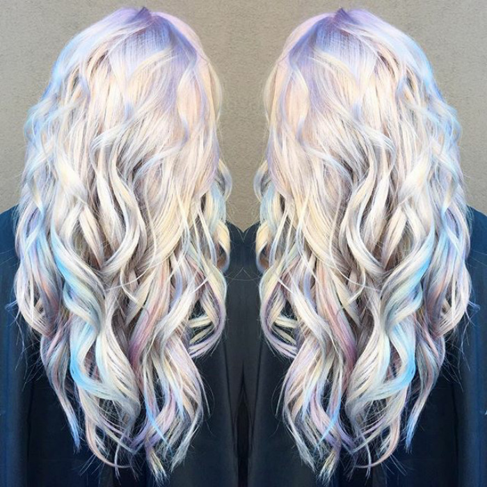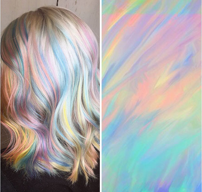 Los talentosos peluqueros de Ross Michaels Hair Salon parecen haber sido los primeros en traer el término «holográfico» al mundo del teñido capilar. Mezclando tonos rubios con lavanda pastel, rosa bebé y azul brillante consiguieron el deseado efecto holo metálico.