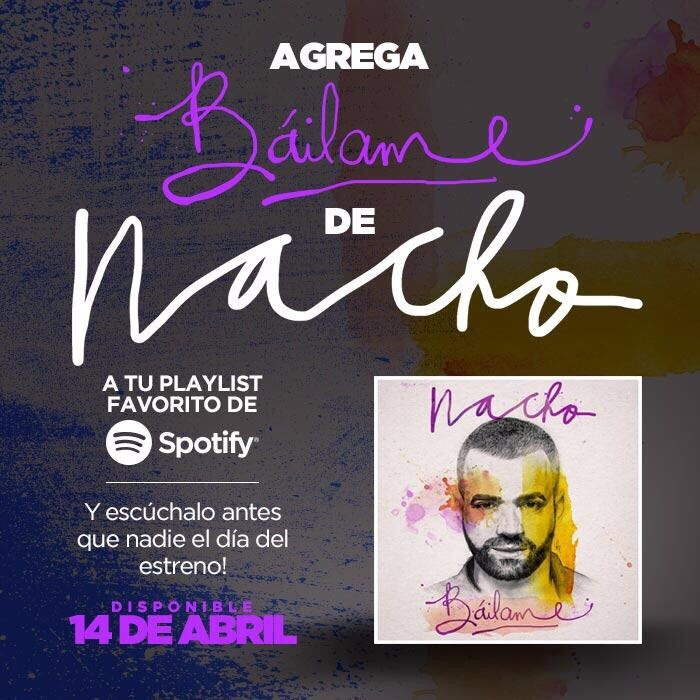 Además la canción podrá ser descargada en las principales plataformas digitales como Apple Music, Spotify, Itunes, Google Music , Pandora y Amazon Music, a partir del 14 de Abril y quienes pre ordenen el tema podrán escucharlo antes que nadie en su fecha de estreno. “Báilame” que también fue compuesto por el artista, es la apuesta segura con la que Nacho emprende el éxito como solista.