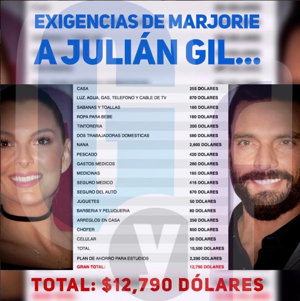 La actriz venezolana Marjorie de Sousa está exigiendo la modica suma de $12,790 como pensión a su ex pareja Julián Gil, según informa el programa de chismes, El Gordo y la Flaca.