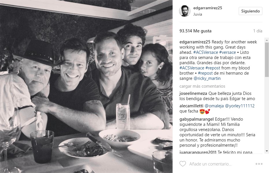 «Ya estoy listo para otra semana de trabajo con esta pandilla. Tenemos grandes días por delante. Aquí comparto esta imagen de mi hermano de sangre, Ricky Martin», escribió el venezolano en su perfil de Instagram junto a una imagen que le retrata sonriente junto a su ‘hermano’ y otros miembros del elenco de la serie. La misma instantánea, como bien apunta el guapo actor, fue compartida poco antes por Ricky en la misma plataforma.