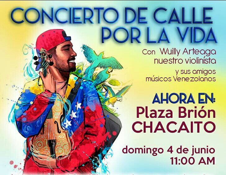 El joven violinista, conocido por su forma particular de protestar contra el régimen represivo de Venezuela a través de la música y con ella enfrentar el brutal ataque de las fuerzas represivas del estado, Willy Arteaga, invitó a los venezolanos a asistir este domingo 4 de junio a un concierto que ofrecerá en la Plaza Brión de Chacaíto, a las 11:00am.